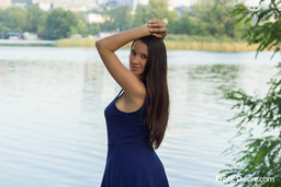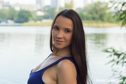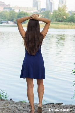 You’ll indeed feel sweet stirrings of erotic desire rise in you as Lean Dey stands in the warm sunset on the bank of a river. The brunette beauty, barely out of her teens (she’s twenty) seems so relaxed as she tugs on her blue frock, showing us her pretty pink-lace-trimmed blue and white polka panties, then sliding down the front to reveal her big breasts. Those boobs are seriously mouthwatering! Music sets the laid back tone; in the distance a boat glides across the water; and our sensuous glamour model soon gets herself completely naked. The stimulating power of softcore nude art photography is really strong here, as Lean just smiles winningly, shows us her lovely body, sitting down at one point to spread her legs and let us peek at her pink pussy; and then standing up and spreading her cheeks to reveal a most charming rosebud!