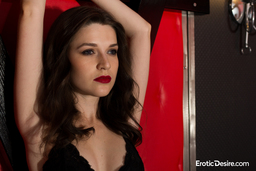 After arousing your desire by looking at Serena’s erotic pictures, you’ll be ready for the sound and motion of this glamour model’s video as she first poses very seductively in her black lingerie, fishnets, and heels in front of a black X-cross. There is a BDSM vibe but it’s playful, not heavy. Serena teases us, shows us her luscious breasts and nipples, then moves over to the bed where, behind a curtain of chains, she slips out of her fishnets and shoes and is soon writhing before our cameras, almost as if she’s on a kind of kinky stage. Getting completely nude, she lifts up her crotch and shares her shaved pussy and alluring asshole in powerful closeups, and with her ultimate smile she seems to understand that we now ache to leap in there with her and enjoy her charms oh so deeply!