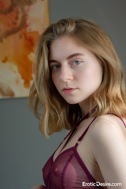 From the moment we observe young Shayla, we are struck by her serious face, although her movements seem relaxed and casual. What is going through the head of this honey-blonde blue-eyed glamour photography model? Her almost translucent ivory skin and hard pink nipples tempt us from the moment we see them accented by her see-through maroon bra and panties. Our erotic desire is set off even more once she peels down to nakedness. Suddenly she gives us a warm smile and a sense of playfulness enters her nude photos and softcore video; she gives exciting views of her smooth, shaved pussy with the flowery lips tucked neatly in; and we can’t help but think of what it would be like to play with that flower, and kiss and caress and merge with this sleek girl whose eyes look at us knowingly but also with warm, inviting friendliness!